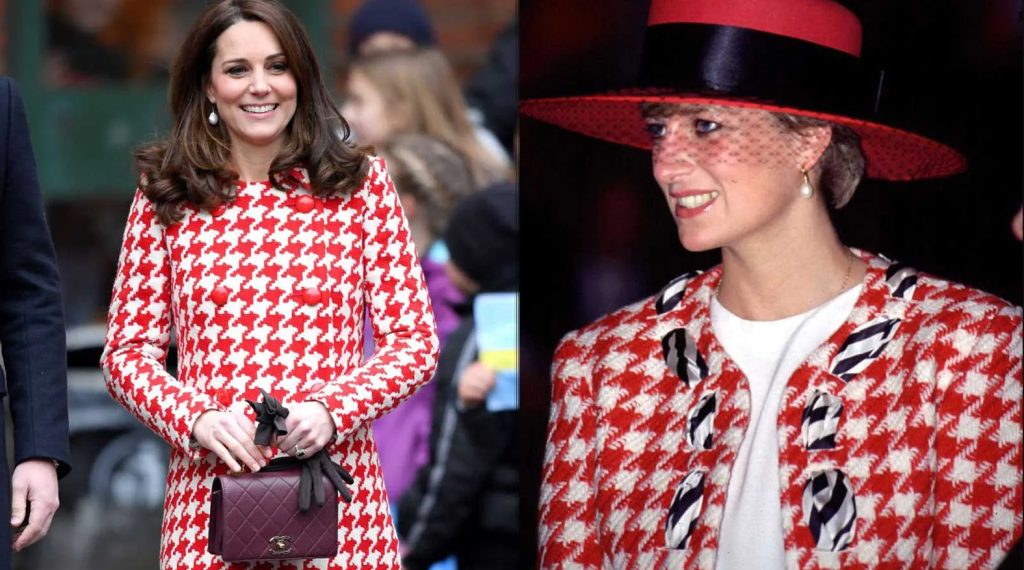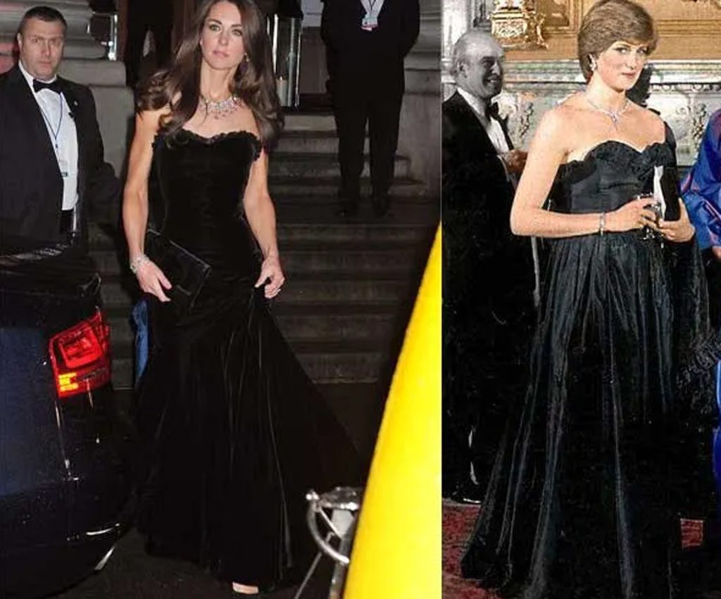 Veja a seguir algumas roupas icônicas utilizadas por Lady Di e as releituras feitas por Kate.