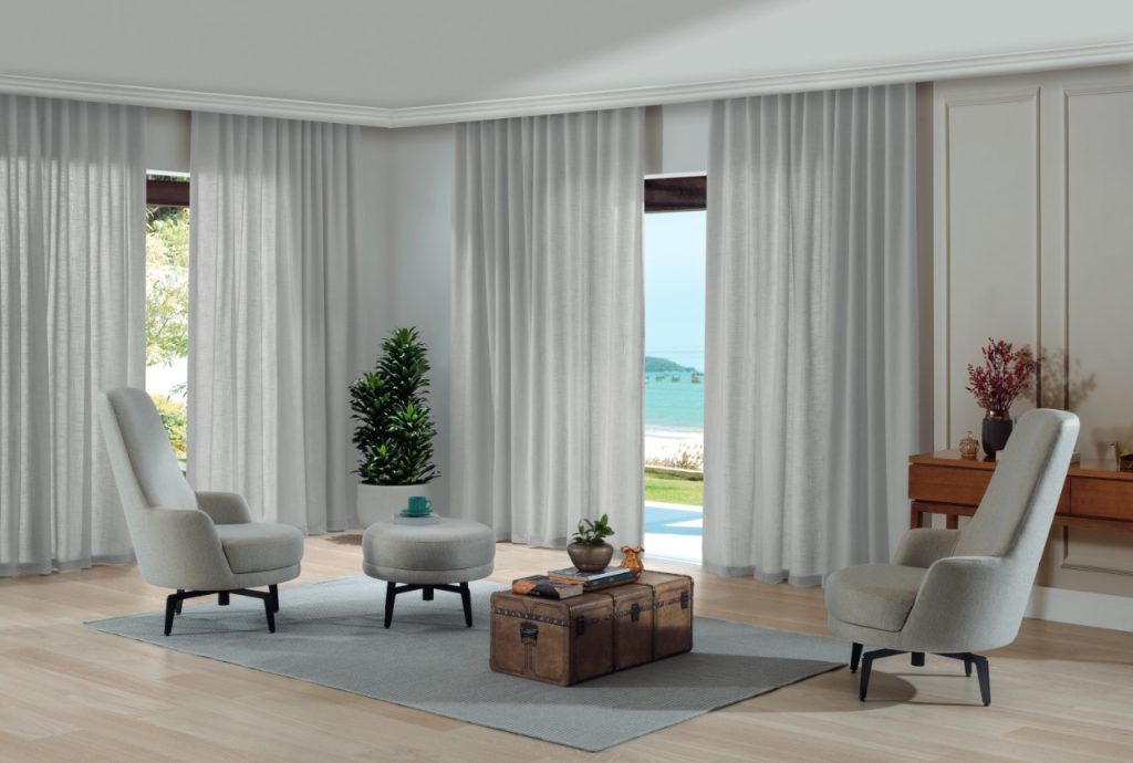 Cortinas com deslizantes são configuradas para atender sancas e ambientes com pé direito mais alto, que geralmente são salas de jantar e estar, além de quartos.