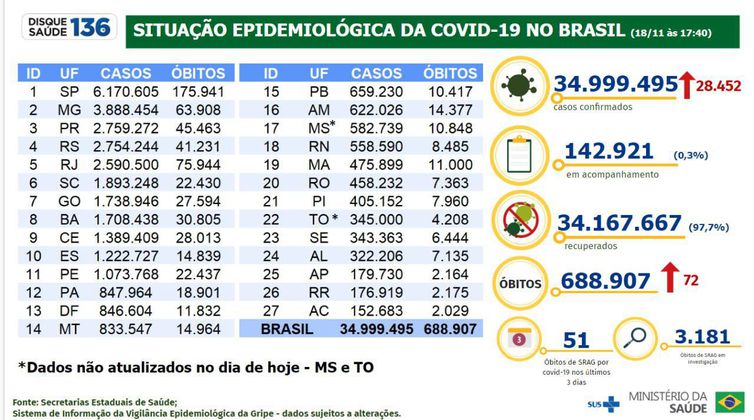 Com as novas informações, o total de pessoas infectadas pelo novo coronavírus durante a pandemia já soma 34.999.495.