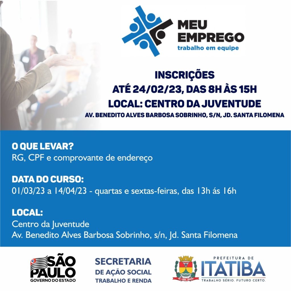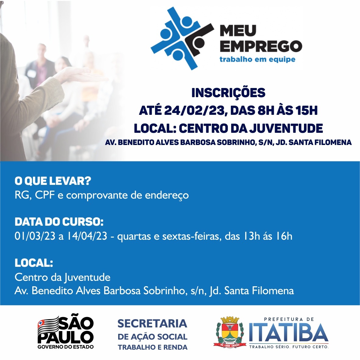Por meio da Secretaria de Ação Social, Trabalho e Renda, a Prefeitura de Itatiba deu início às inscrições para o Programa Meu Emprego – Trabalho em Equipe, uma iniciativa da Secretaria de Desenvolvimento Econômico do Governo do Estado de São Paulo.