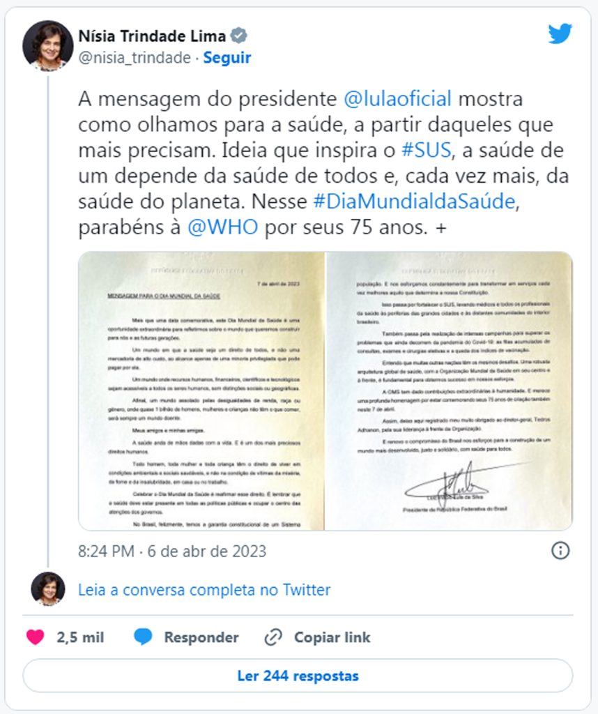 “No Brasil, felizmente, temos a garantia constitucional de um Sistema Único de Saúde, o SUS, que assegura o acesso gratuito aos serviços por toda a população. E nos esforçamos constantemente para transformar em serviços cada vez melhores aquilo que determina a nossa Constituição”, escreveu.