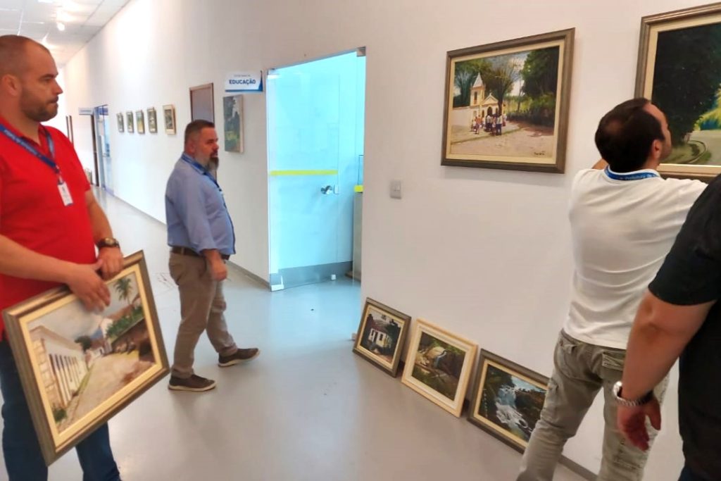 A mostra inclui quadros inéditos pintados neste ano e já chama a atenção dos servidores que passam pelo corredor interno do Centro Administrativo Prefeito Ettore Consoline.