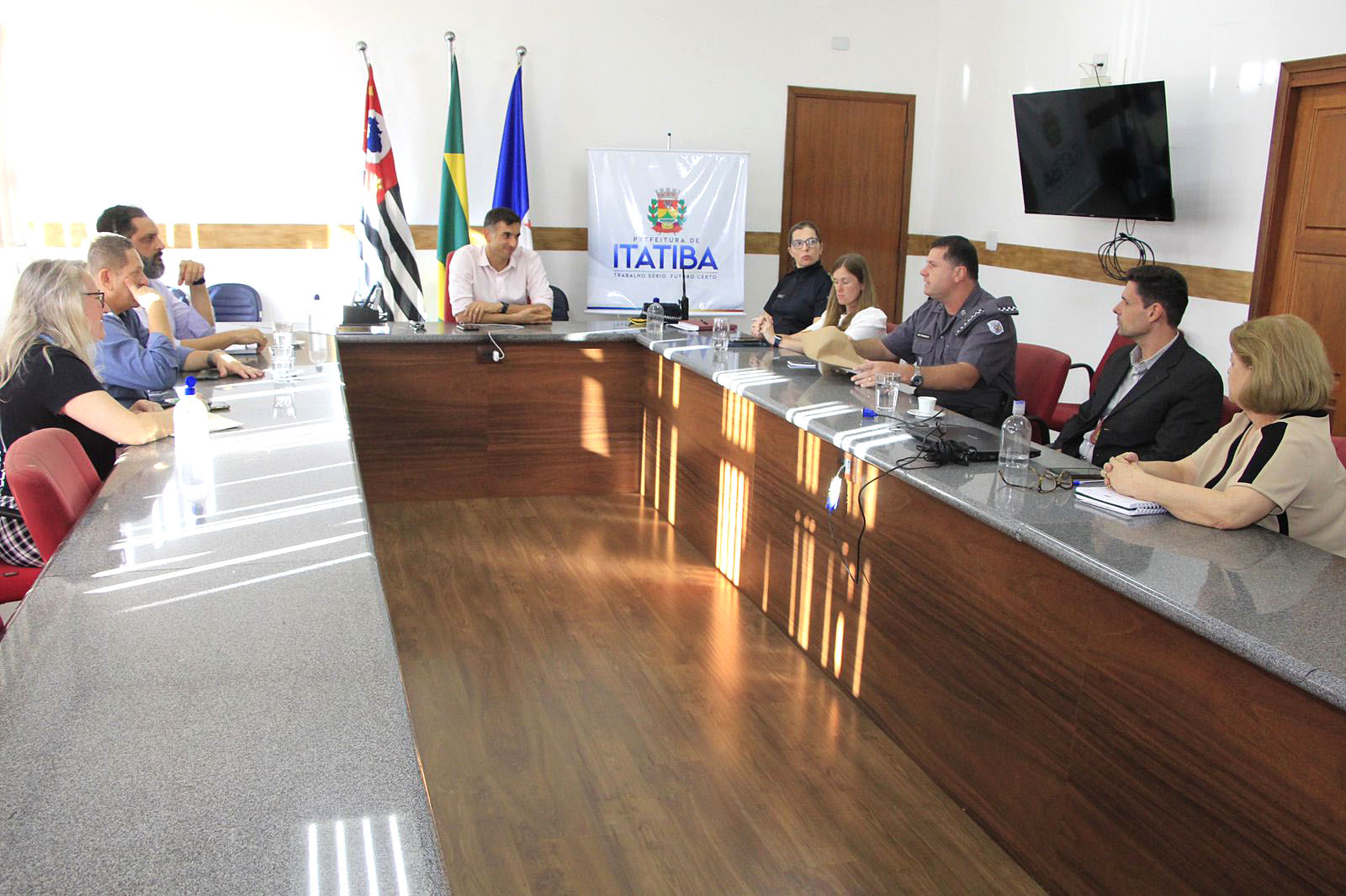 Representantes das forças de segurança do município em reunião na Prefeitura de Itatiba na tarde desta terça, 11/04. Foto: Mari Giro e Renato Jr/PMI