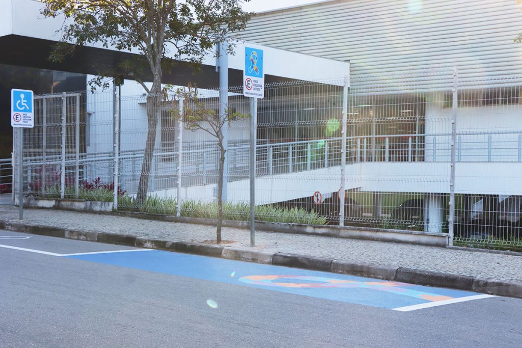 Para a pintura da vaga, foi usado o símbolo da fita quebra-cabeças, que serve como um lembrete poderoso da diversidade e singularidade que compõem o espectro do autismo. Cada peça do quebra-cabeça representa uma pessoa autista, com suas características únicas. O espectro do autismo abrange uma ampla gama de habilidades e diferenças individuais. Assim como cada peça de um quebra-cabeça se encaixa de maneira única para formar uma imagem completa, cada pessoa autista contribui de maneira especial para a coletividade.