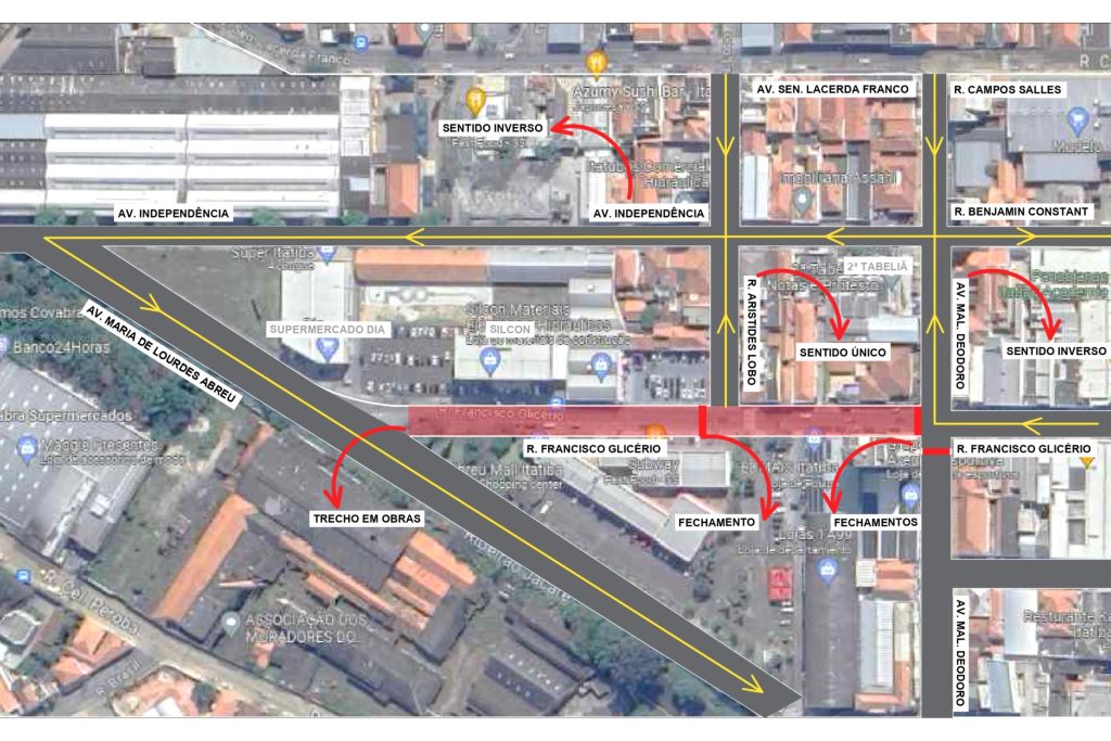Devido ao fechamento do trecho, quem desce a Rua Francisco Glicério terá desvio obrigatório à direita na Av. Mal. Deodoro, podendo em seguida transitar tanto sentido Centro, para a direita na Rua Benjamin Constant, quanto o desvio sentido bairro, para a esquerda na Av. Independência, que levará até a Av. Maria de Lourdes Abreu. Serão estes os dois trechos que estarão com sentido inverso.