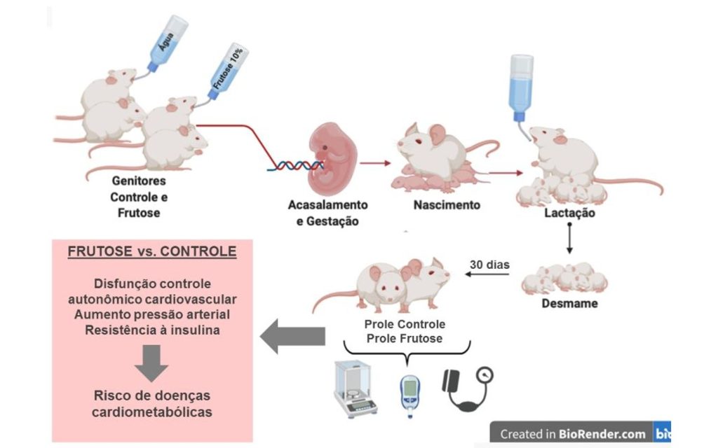 No estudo publicado agora, os cientistas submeteram os animais a uma ingestão de 10% de frutose na água por 60 dias antes do acasalamento. A prole foi avaliada 30 dias após o desmame e não recebeu frutose em sua dieta.