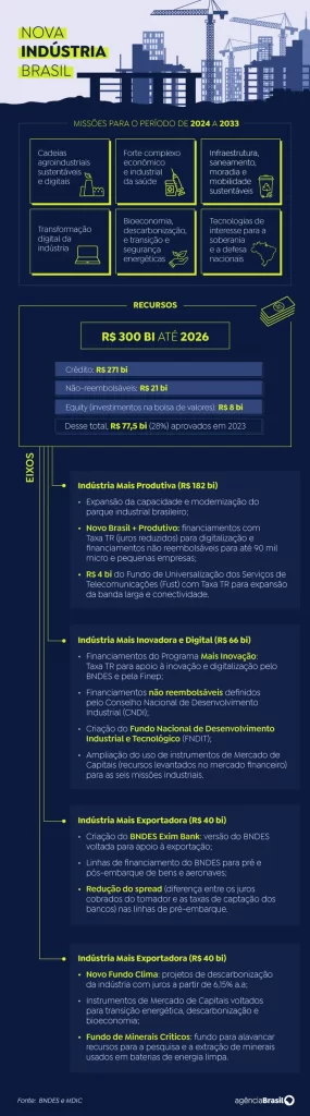 A nova política tem seis missões relacionadas à ampliação da autonomia, à transição ecológica e à modernização do parque industrial brasileiro. Entre os setores que receberão atenção, estão a agroindústria, a saúde, a infraestrutura urbana, a tecnologia da informação, a bioeconomia e a defesa.