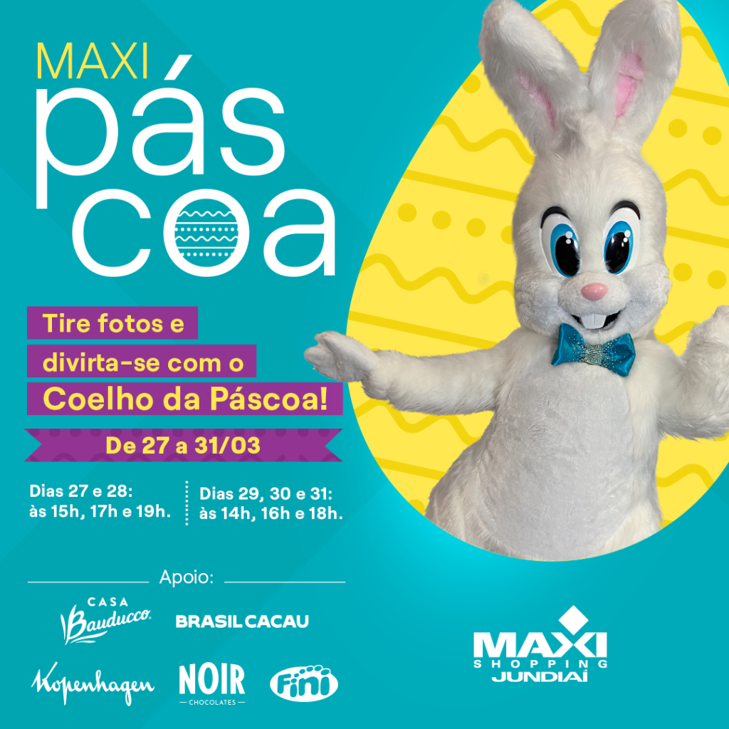 De 27 a 31 de março o Maxi Shopping Jundiaí festeja a Páscoa oferecendo muita animação para a garotada, num evento itinerante gratuito. A ordem é procurar o Coelho e sua assistente percorrendo os corredores do Shopping. Ao encontrar a figura saltitante, de grandes orelhas, a diversão acontece. Esse momento vai ser recheado de muita interação valendo até fazer pose para tirar aquela foto de recordação com o Coelho. E atenção: o Coelho vai estar no Maxi nos dias 27 e 28, às 15h, 17h e 19h; e dias 29, 30 e 31, às 14h, 16 e 18h. Não percam. Convide seus amiguinhos, vai ser incrível.