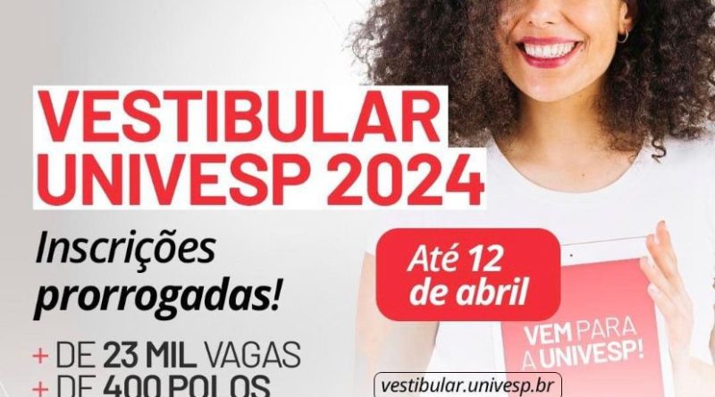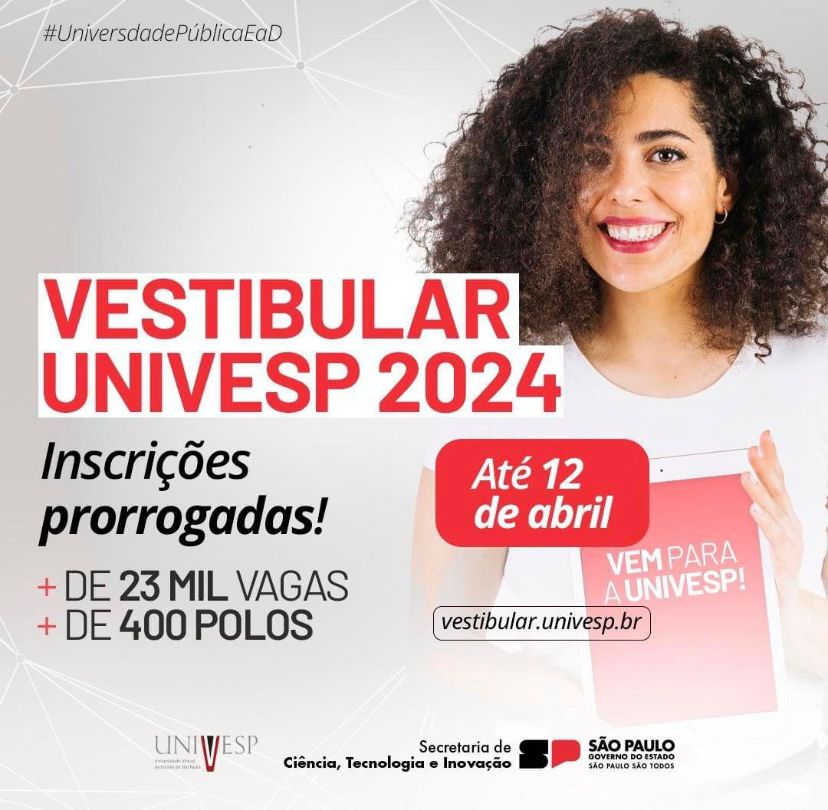Foram prorrogadas até esta sexta-feira (12/04) as inscrições para o Vestibular 2024 da Universidade Virtual do Estado de São Paulo (Univesp), com aulas gratuitas e online. O Polo Itatiba fica na Emeb Profa. Eliete Ap. Sanfins Fusussi, na Av. Urbano Bezana – s/n, no NR Porto Seguro.