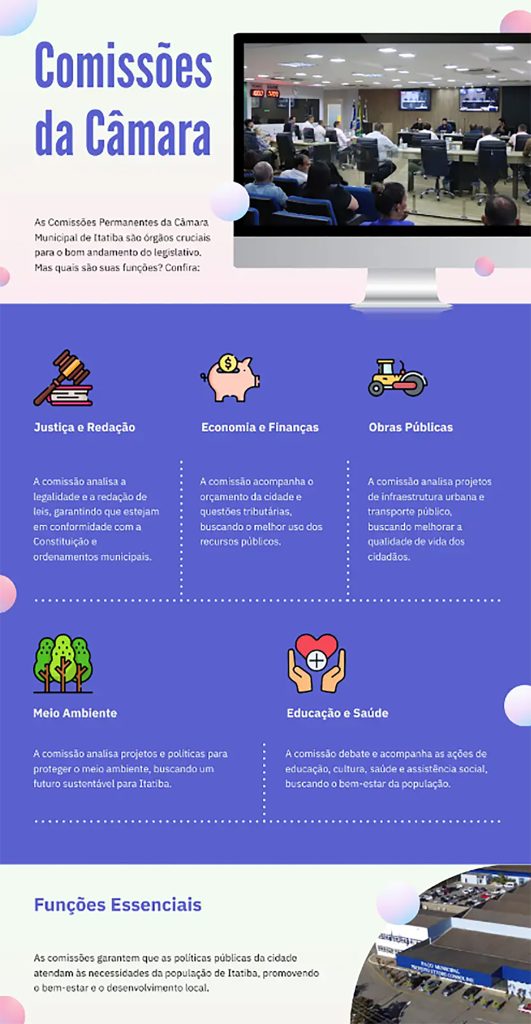 As Comissões Permanentes desempenham um papel essencial no Legislativo municipal, funcionando como órgãos de consulta especializados em diferentes áreas. Elas garantem que as propostas analisadas pela Câmara sejam amplamente debatidas e contribuam para o desenvolvimento de Itatiba.