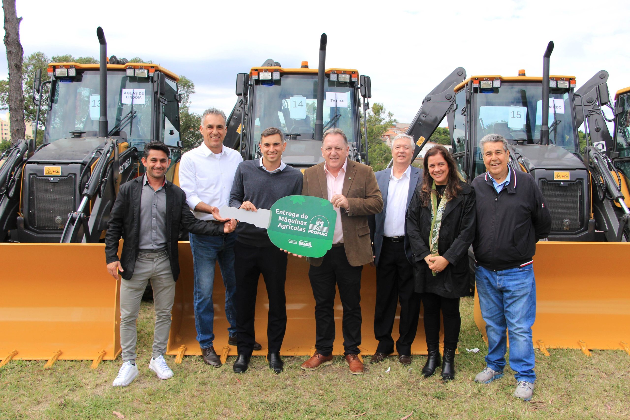 Nova retroescavadeira já foi integrada à frota municipal para dar suporte à produção rural de Itatiba. Entrega foi nesta segunda-feira (12/05) ao prefeito Thomás Capeletto e autoridades municipais por representantes do Ministério da Agricultura. Foto: Renato Jr/PMI
