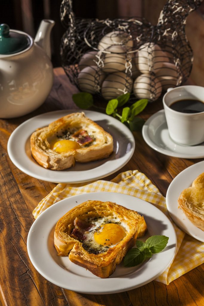 Café colonial com pães, bolos e queijos caseiros, servido em ambiente familiar com bela vista para as paisagens rurais.