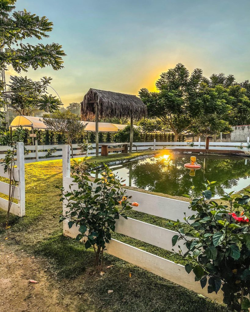 Buffet variado em espaço com fazendinha, lago ornamental e muita natureza.