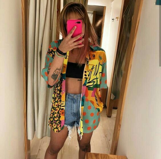 - Sobreposição de biquíni colorido com camisa aberta ou colete